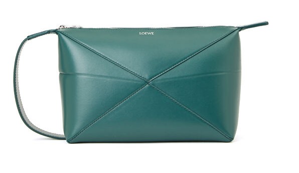 Loewe’nin ilkbahar-yaz 2025 sezonunda yer alan “puzzle” koyu yeşil tıraş çantası, yüzde 50 dana derisi, yüzde 27 pamuk, yüzde 23 keten karışımdan oluşan son derece kullanışlı ve fark yaratan bir tasarıma sahip.