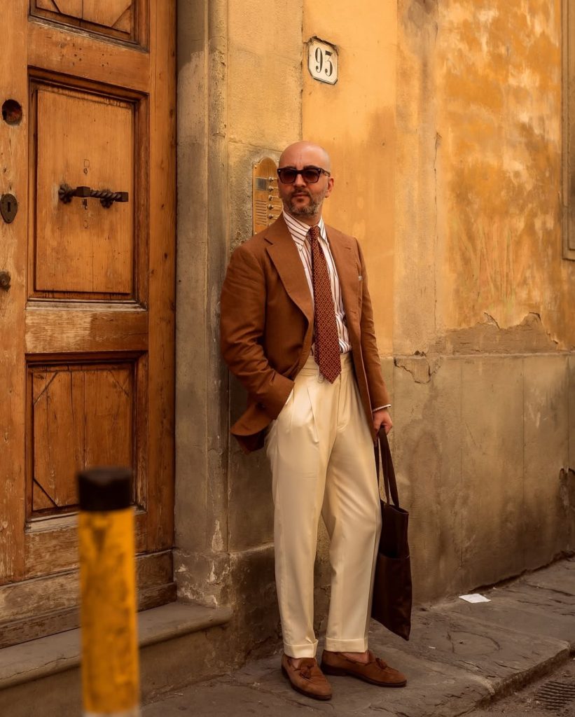 Camel rengi, iyi kumaştan dikilmiş bir palto ve lacivert kruvaze blazer. İkisi de zamansız, her durumda kullanılabilir parçalar.