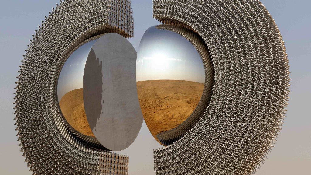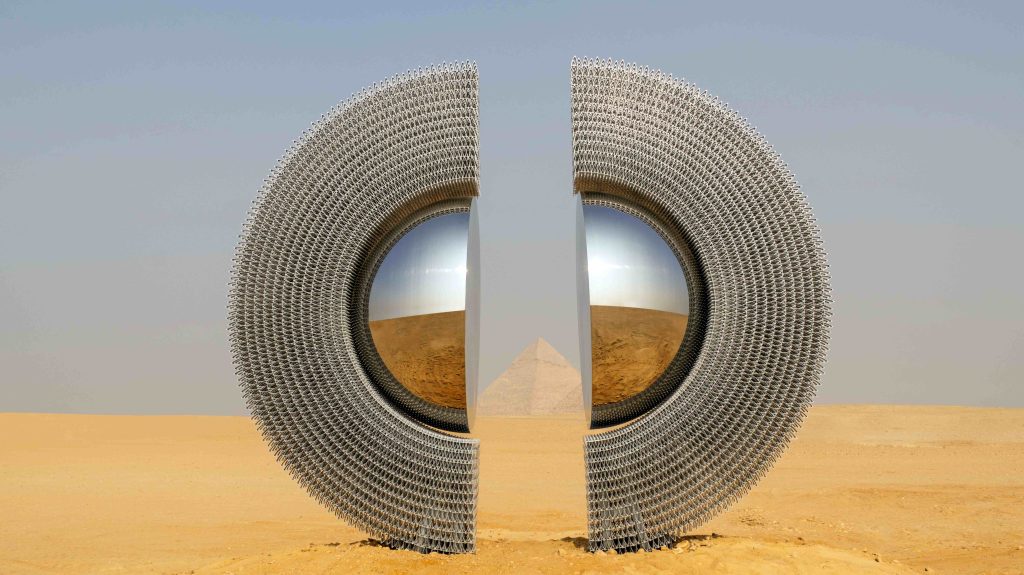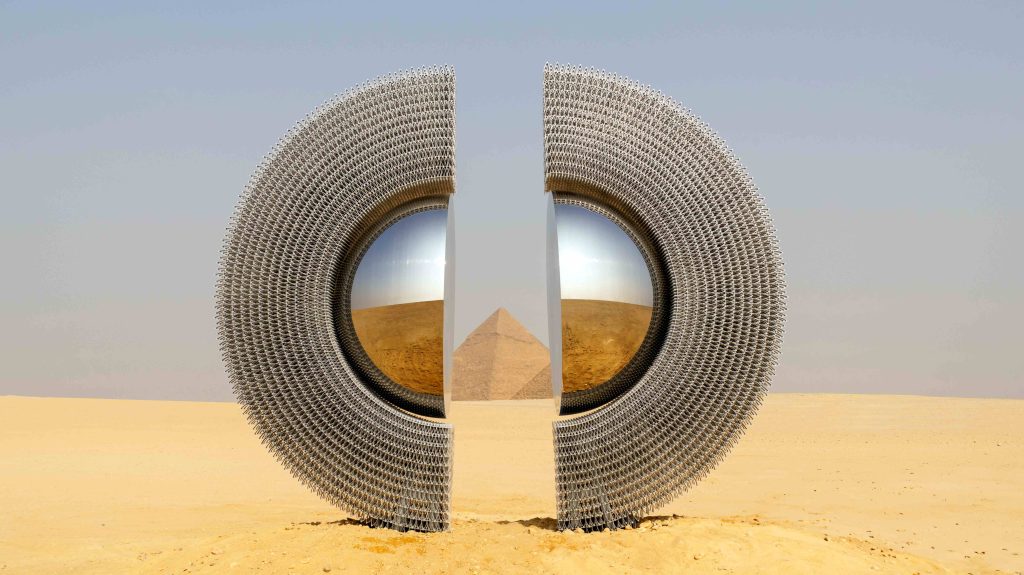 Antik Mısır’da sonsuzluk, bütünlük ve ilahi koruma anlamına gelen Shen halkasından ilham alan Köse, bu sembolü zamansızlık ve denge üzerine çağdaş bir yoruma dönüştürüyor. Parlak yüzeyleriyle izleyiciyi hem çevresiyle hem de kendi varlığıyla ilişki kurmaya davet eden eser, piramitlerin önünde sembolik bir köprü görevi üstleniyor.