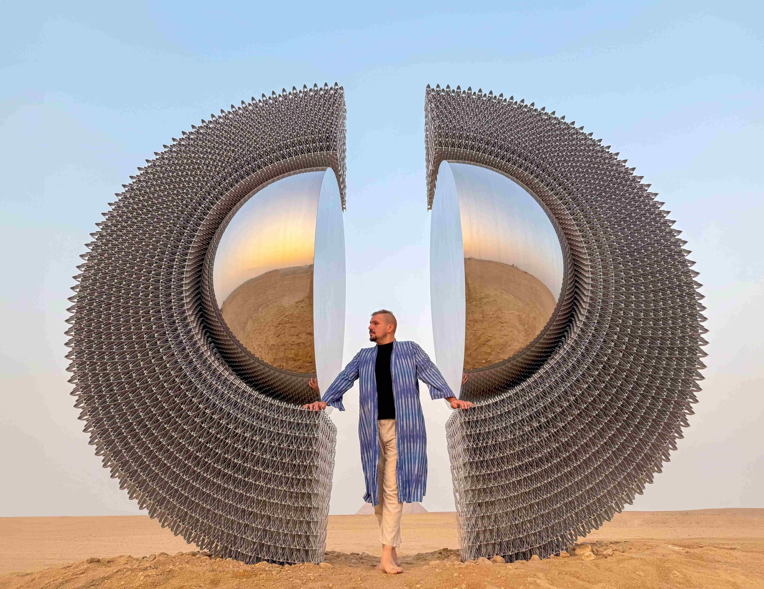 Antik Mısır’da sonsuzluk, bütünlük ve ilahi koruma anlamına gelen Shen halkasından ilham alan Köse, bu sembolü zamansızlık ve denge üzerine çağdaş bir yoruma dönüştürüyor. Parlak yüzeyleriyle izleyiciyi hem çevresiyle hem de kendi varlığıyla ilişki kurmaya davet eden eser, piramitlerin önünde sembolik bir köprü görevi üstleniyor.