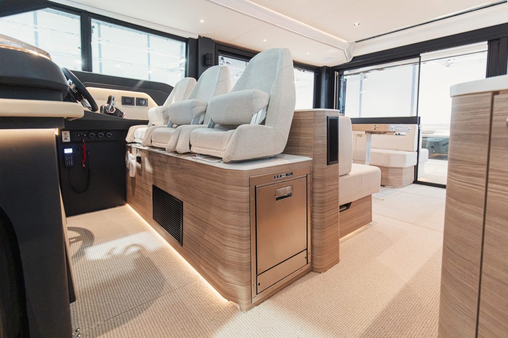 İç mekân, iskele ve sancak balkonları arasındaki geniş mesafe sayesinde oldukça ferah bir atmosfer sunuyor. Dümen mahallinde yer alan üç koltuk, kaptanla birlikte seyir yapma imkânı sağlıyor. Kaptanın hemen arkasında konumlanan televizyon, elektrikli mekanizması sayesinde açılıp kapanabiliyor.