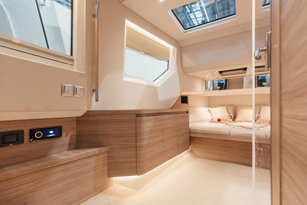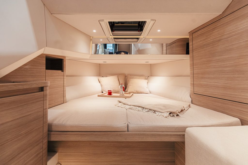 İskele tarafta konumlanan mutfak alanı, tekneyi hem konforlu hem de pratik hale getiriyor. Geniş yüzme platformu, havuzlu yapısı ve büyütülen arka alanlar deniz keyfini üst seviyeye taşıyor. İç mekâna geçildiğinde ise, Saxdor 400’e kıyasla belirgin şekilde büyüyen ana kabin ilk dikkat çeken detaylardan biri oluyor. Talep edilmesi halinde kıç tarafta ek bir kabin seçeneği de sunuluyor. Yan balkonlarda ise şezlong, hamak ve masa yerleşimi mümkün.